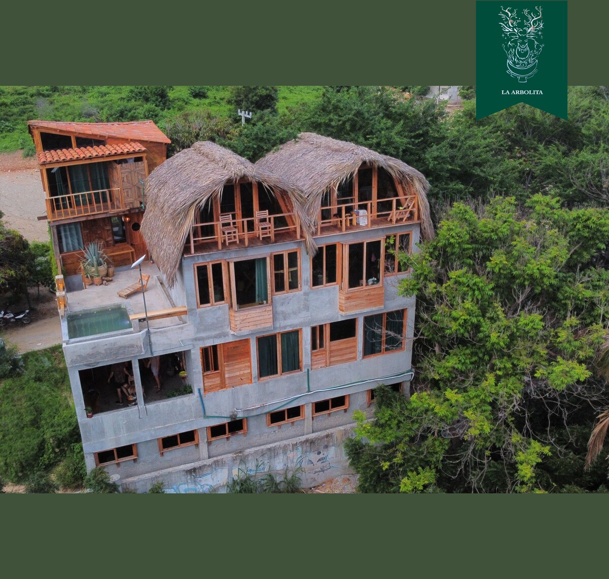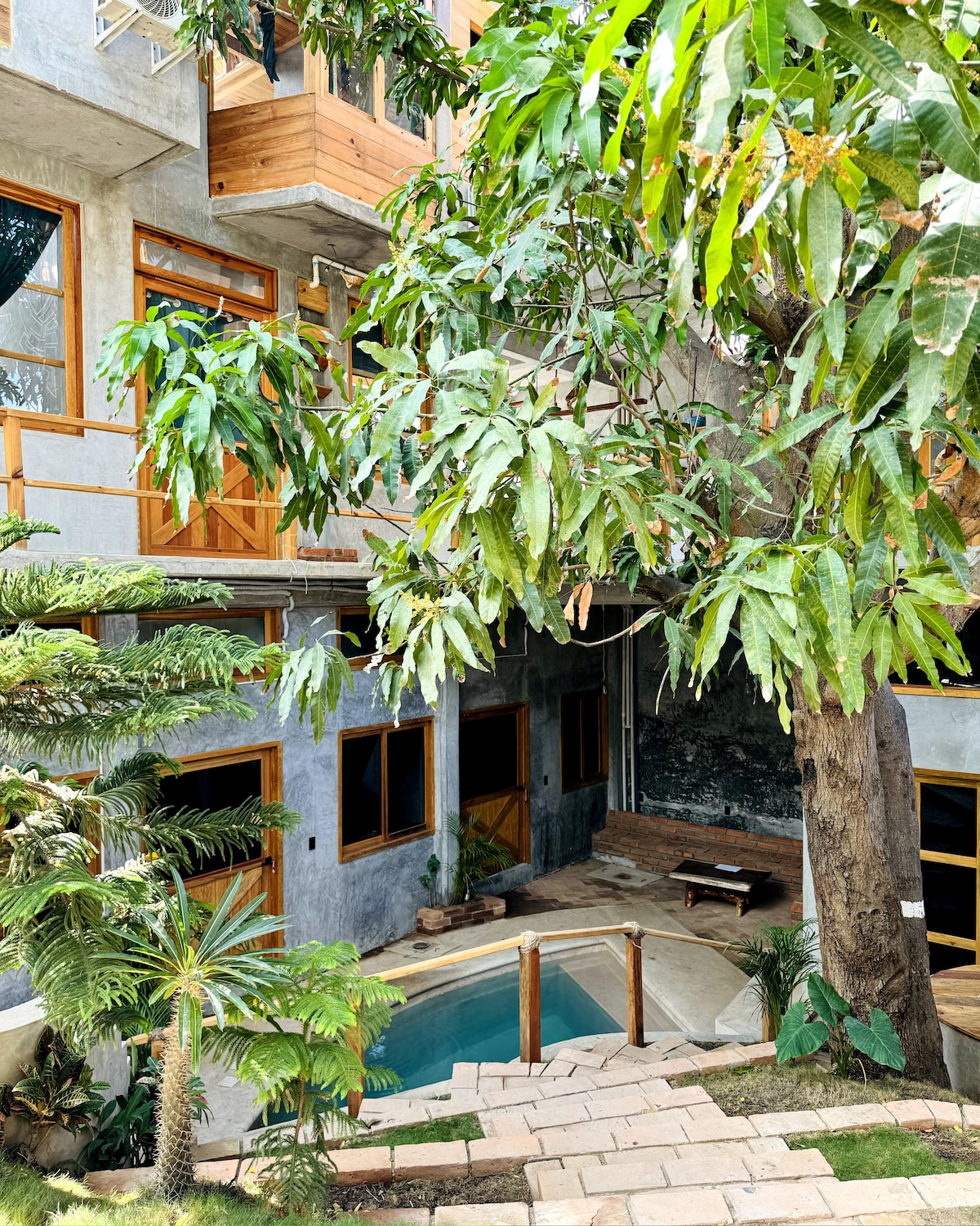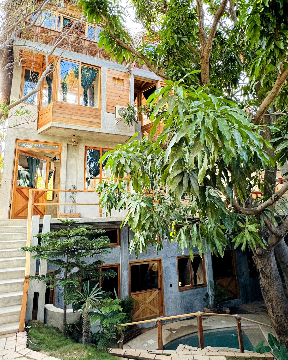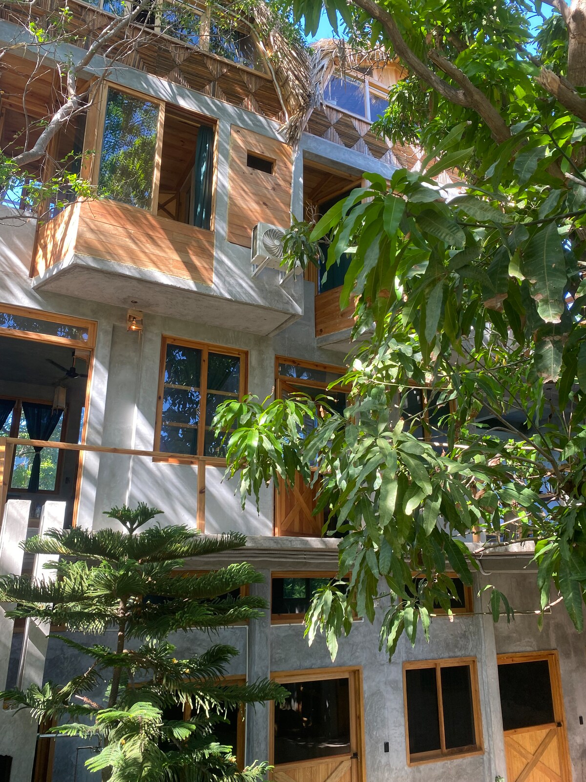 Escape to this designer oasis where 22 guests can unwind in style! Set among lush trees, our unique property combines privacy with social charm, offering 10 beds, each with AC, bathroom, and Starlink WiFi. Enjoy two pools (one with ocean views), a communal kitchen, and a laid-back vibe perfect for mingling. Conveniently located and just steps from Zicatela Beach and Market, this architecturally rich, breezy retreat is crafted for comfort, nature lovers, and social adventurers alike.